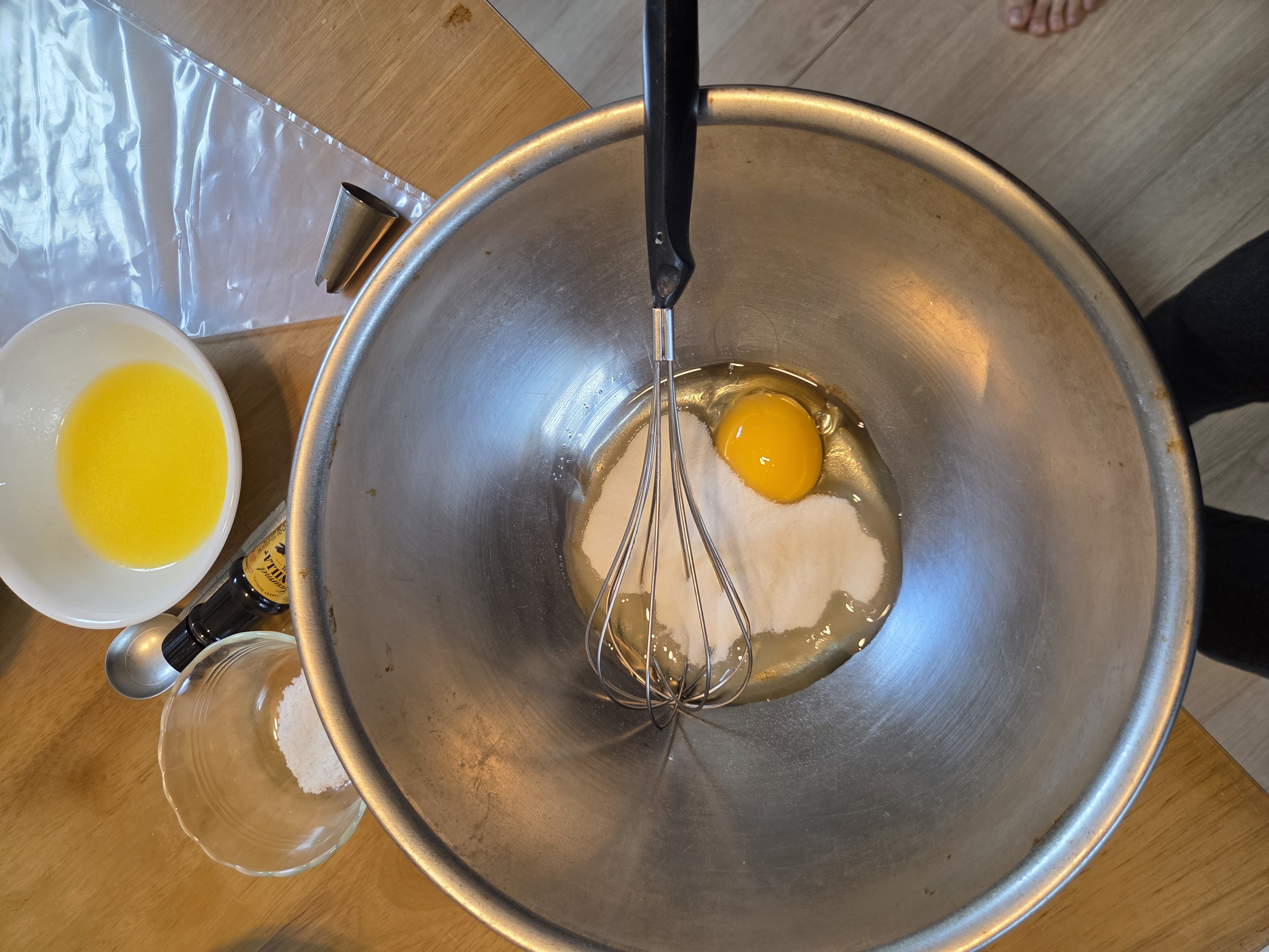 2. 볼에 달걀 1개와 설탕을 넣고 거품기로 잘 저어줍니다.